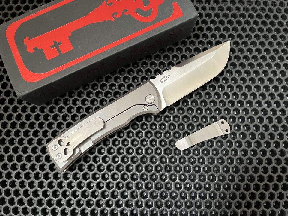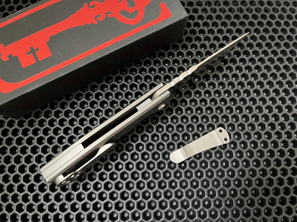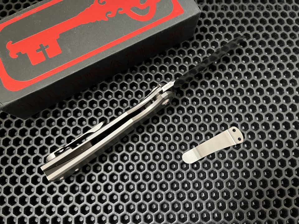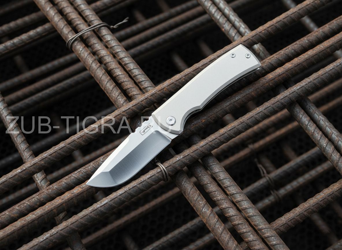 Лезвие изготовлено из стали M390, которая обладает высокой твёрдостью (58–60 HRC) и отличной износостойкостью. Финишная отделка клинка выполнена в сатиновом стиле, что придаёт ножу элегантный вид.