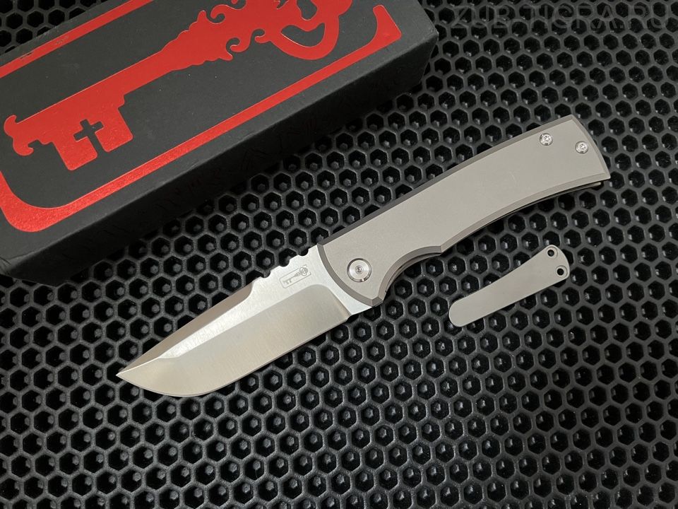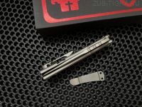 Рукоять ножа имеет длину 116 мм и толщину 14 мм. Она изготовлена из титанового сплава, который обладает высокой прочностью и лёгкостью. На рукояти также имеется клипса с дизайном в виде черепа, которая позволяет носить нож на поясе или кармане.