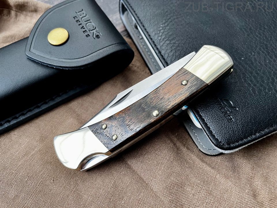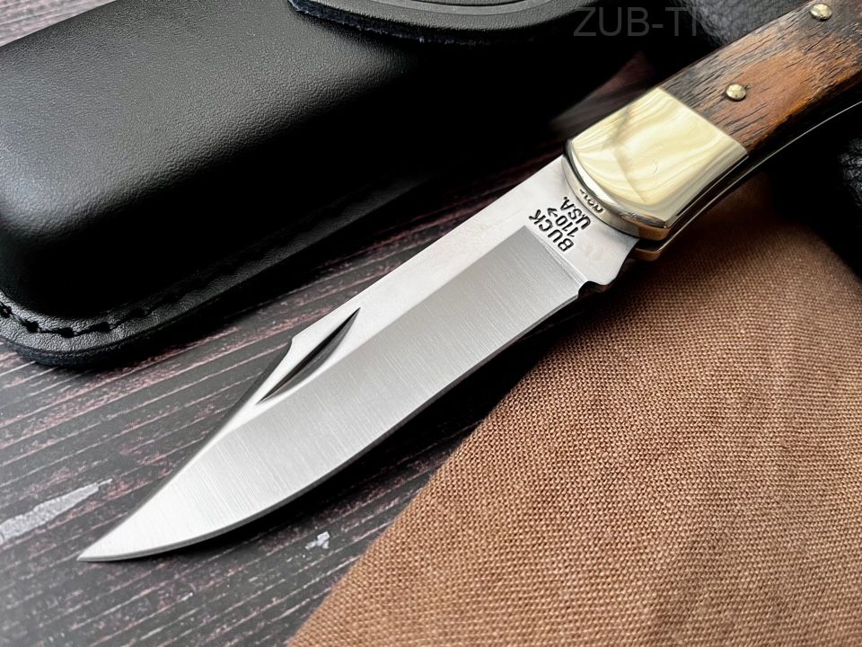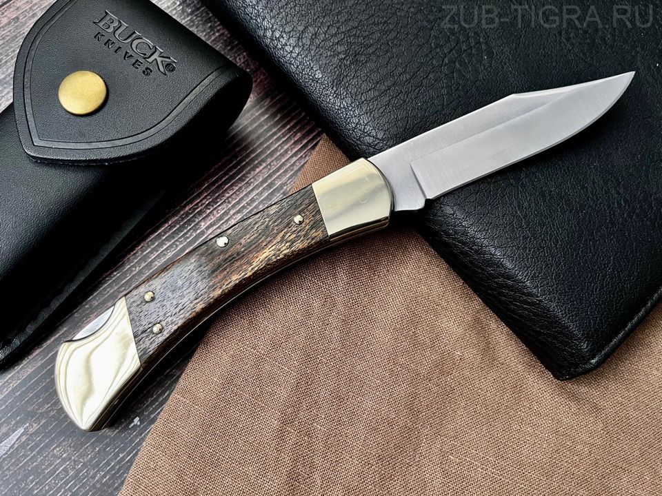 Классический охотничий складной нож Buck 110. Клинок 440C (satin, 59 HRC), рукоять латунь + дерево, общая длина 22 см, вес 250 г, чехол из воловьей кожи. Доставка 1–2 дня.