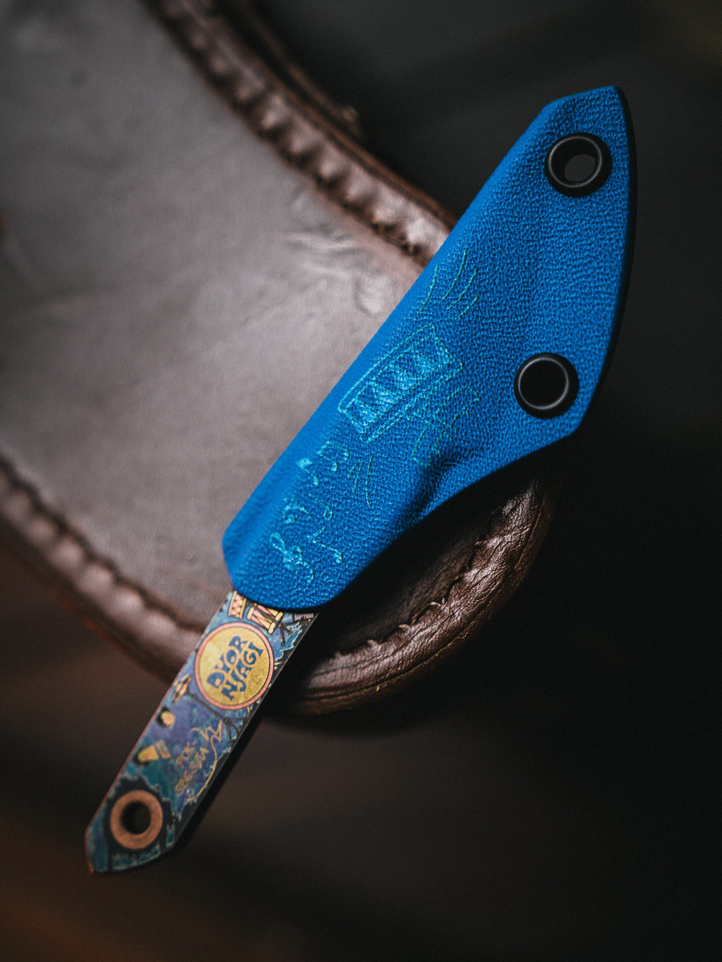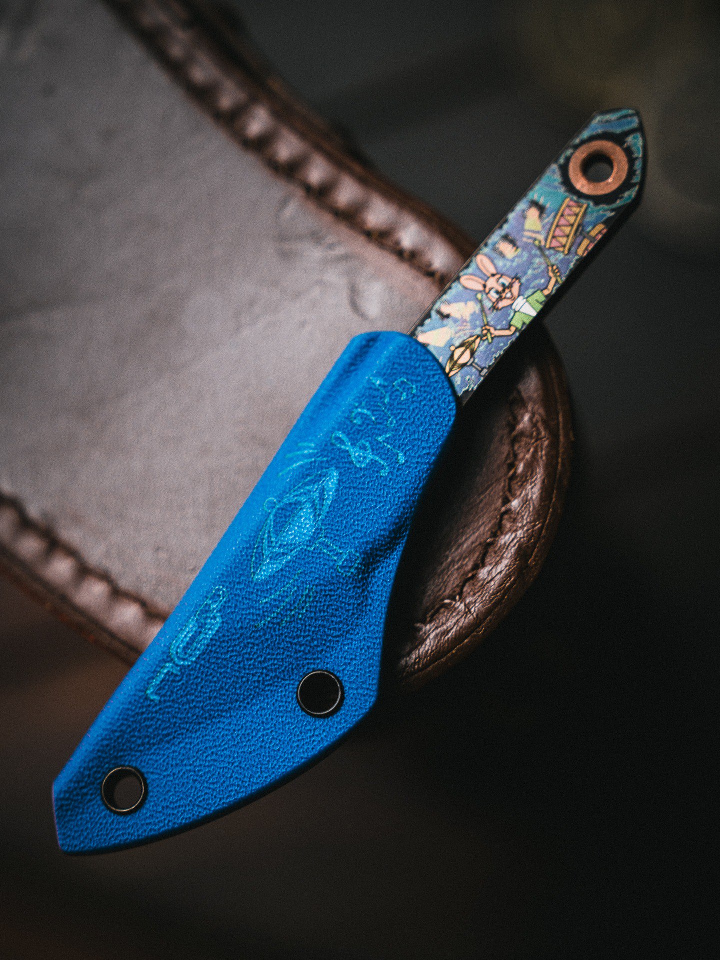 «Изюминкой» проекта, без сомнения, стала эксклюзивная лазерная гравировка на боковой поверхности клинка. На матовом фоне чернения Blackwash мастерски выгравирована динамичная сцена из культового советского мультфильма «Ну, Погоди!» — Заяц, бьёт по барабанам, а волк играет на гитаре. Это не просто рисунок, это высокоточное и детализированное изображение, которое придает ножу уникальный характер и эмоциональную ценность. Каждый раз, вынимая киридаши из кармана или чехла, вы будете встречаться с любимым героем, что превращает обычный инструмент в предмет для коллекционирования и повод для приятных воспоминаний.